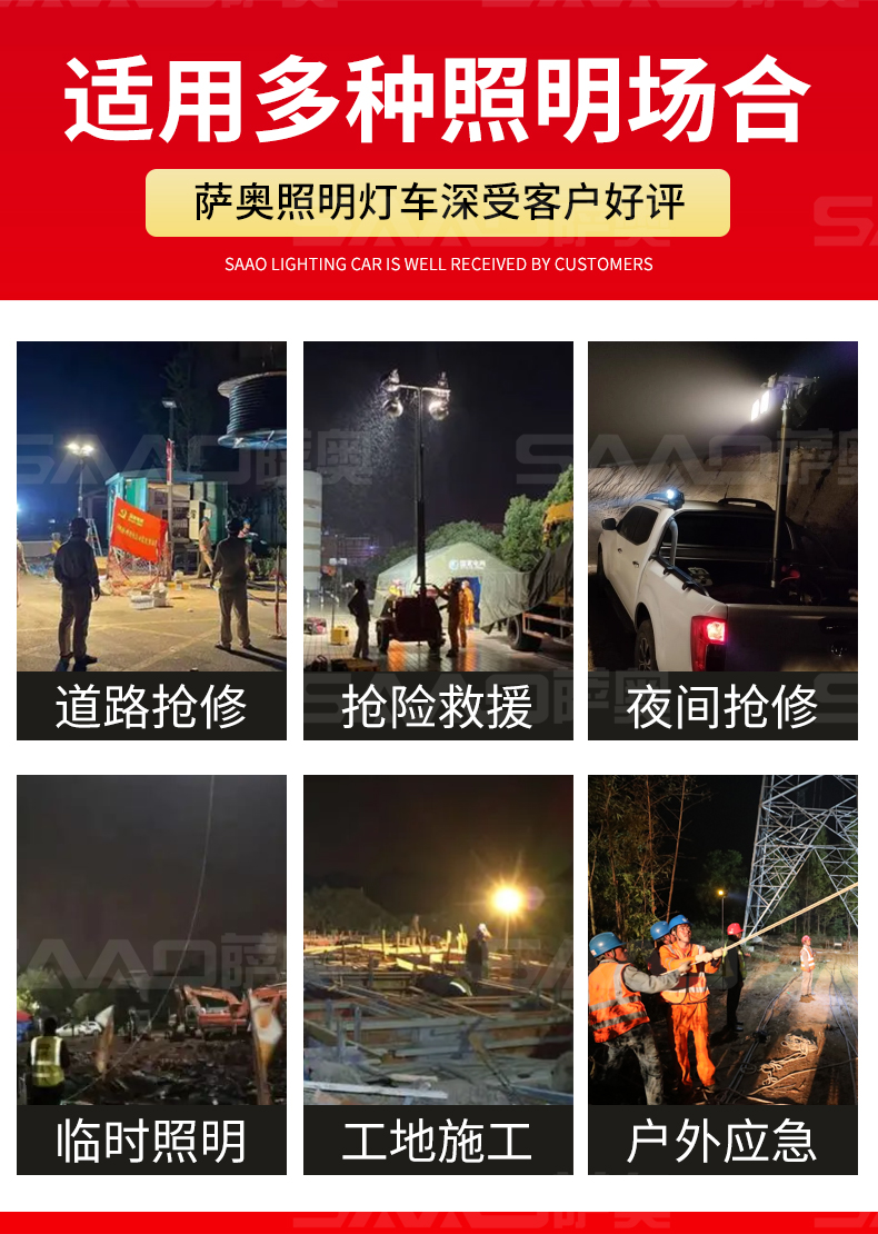 用于體育場館、機場、碼頭等大型公共場所,公路、鐵路、電力等緊急搶險現(xiàn)場,露天采礦現(xiàn)場等。