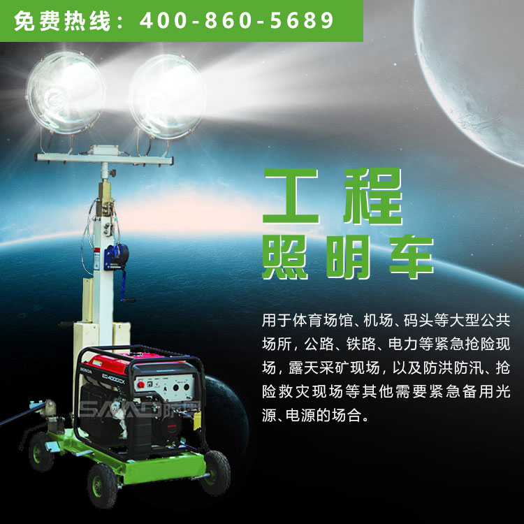 工程照明車SZM-1000B用于體育場館、機場、碼頭等大型公共場所,公路、鐵路、電力等緊急搶險現場,露天采礦現場,以及防洪防汛、搶險救災現場等其他需要緊急備用光源、電源的場合