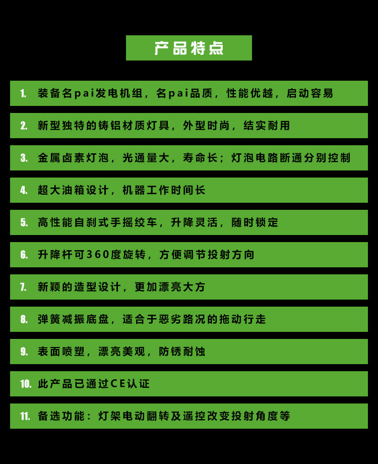 用于體育場館、機場、碼頭等大型公共場所,公路、鐵路、電力等緊急搶險現場,露天采礦現場,以及防洪防汛、搶險救災現場等其他需要緊急備用光源、電源的場合。
