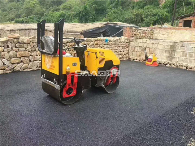 座駕1噸振動壓路機,遼寧施工現場,山底下面的空氣顯得格外的清新,炎熱的夏季了,看著這一片綠油油的樹林,心情也舒暢了很多,薩奧座駕振動壓路機還你一片整平的瀝青柏油大陸!