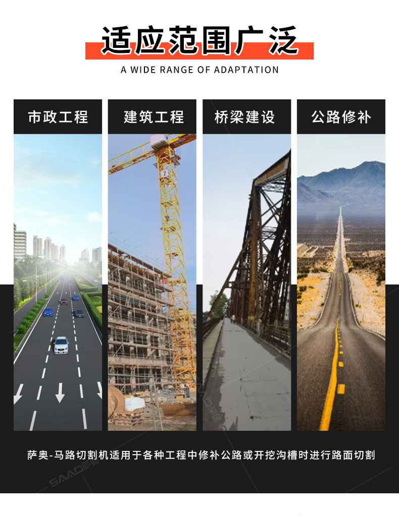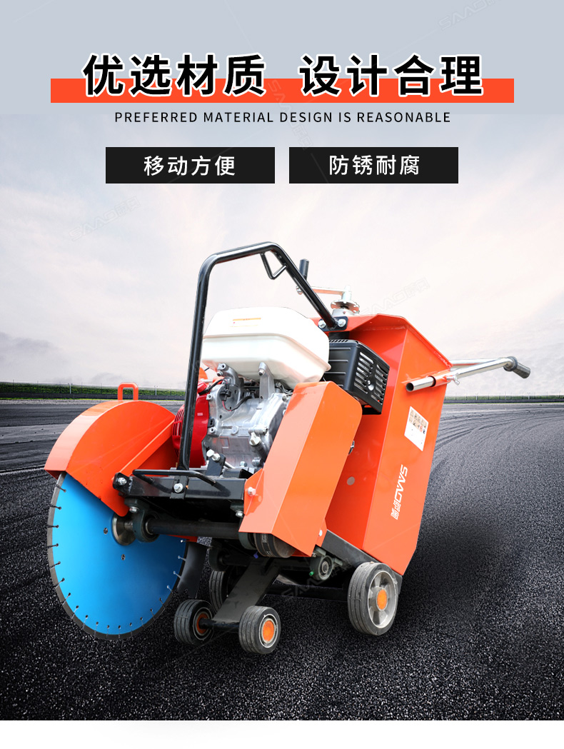 用于公路、市政、建筑、煤氣、通信部門修補公路或開挖溝槽時進行路面切割。相對于電動或柴油動力的路面切割機,操作輕巧省力,運輸方便,工作效率高。