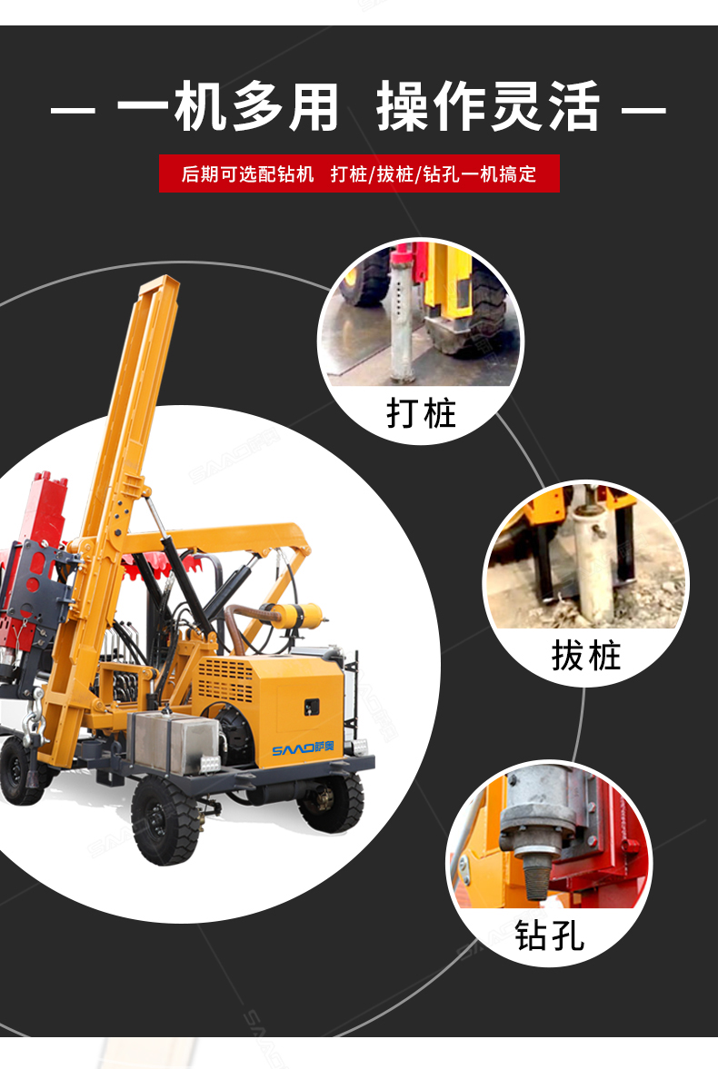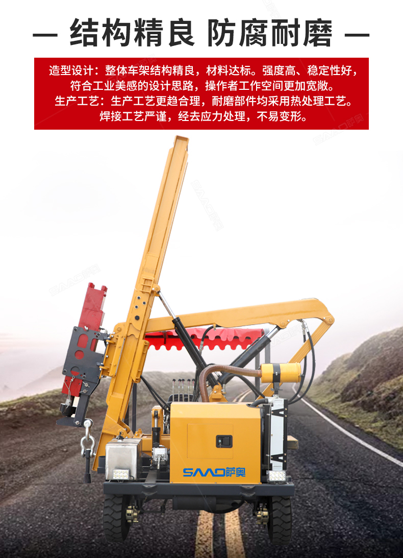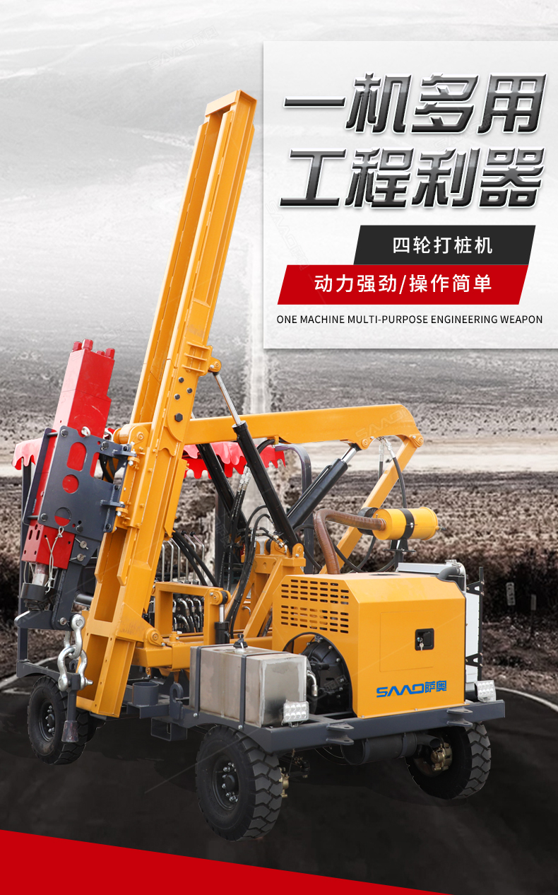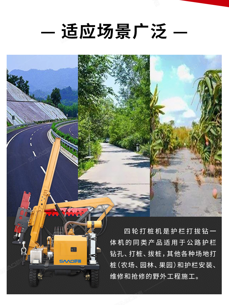小四輪打樁機(jī)適用于公路護(hù)欄鉆孔、打樁、拔樁,其他各種場(chǎng)地打樁(農(nóng)場(chǎng)、園林、果園),公路野外工程施工。