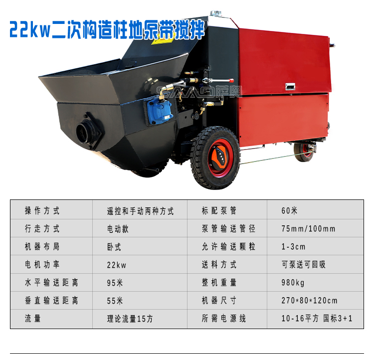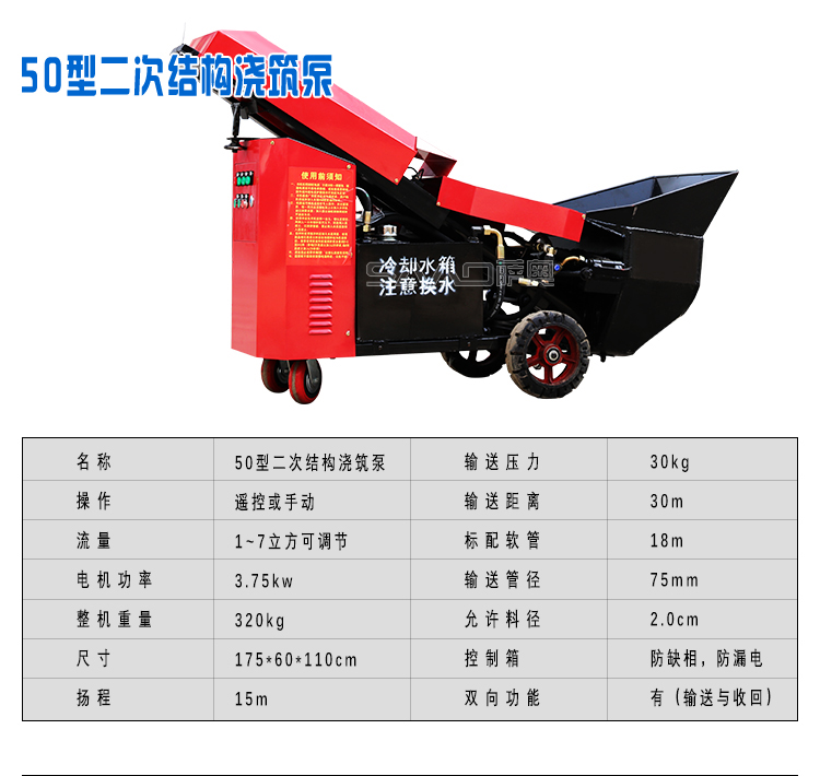 二次結構澆筑泵介紹: 二次構造柱澆筑泵適用于商品房、農村建房,打二次構造柱,圈梁等,是您澆筑的好設備。電機功率小,體積小,重量輕,料斗可升降,真正能提高您的施工效率