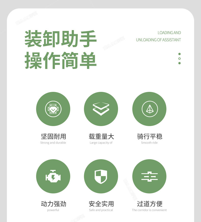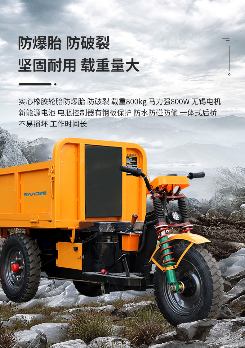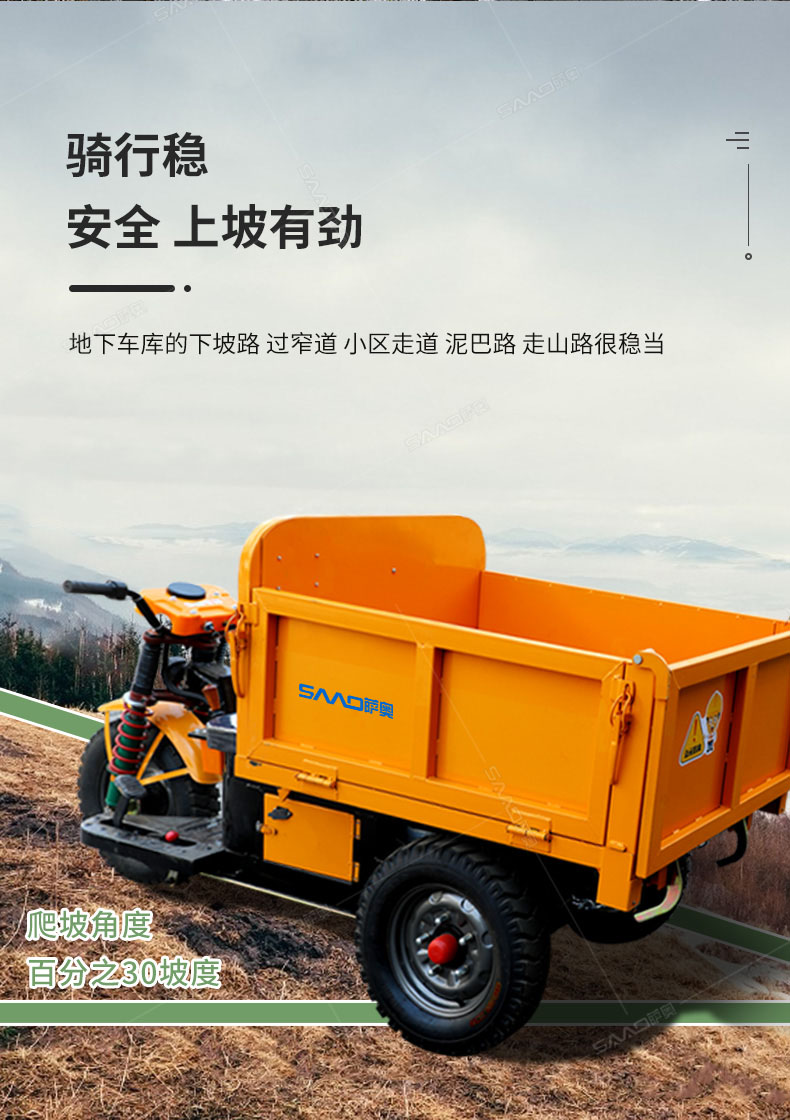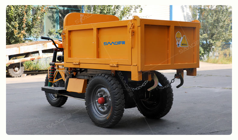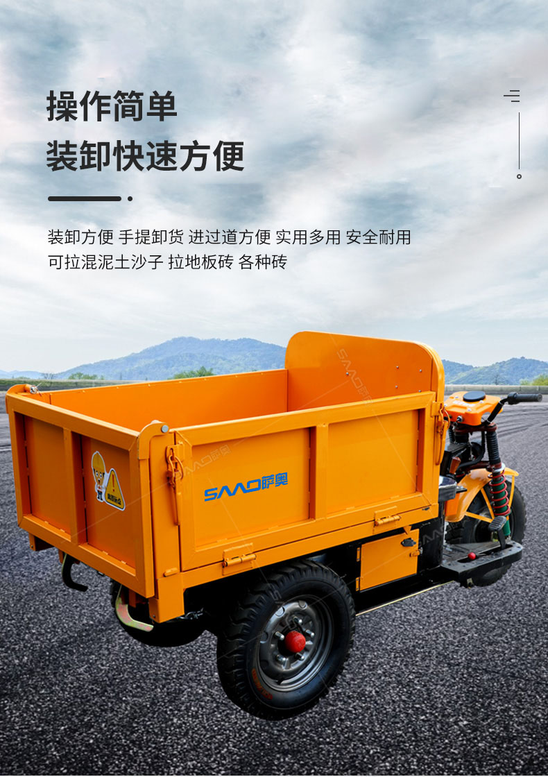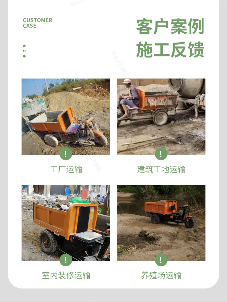 此款車適用于建筑工地、室內裝修、養殖場、工廠等場所,運輸沙子、水泥、土方、混凝土、建筑垃圾生活垃圾、養殖場動物糞便、飼料等,體積小操作簡單靈活,可原地360度轉圈,可