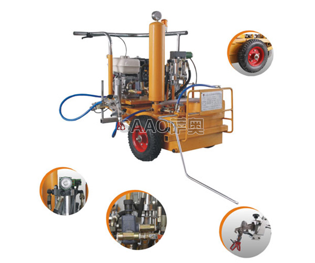 手推式冷噴劃線機為高壓力等流量型無氣噴涂機,該機利用汽油機驅動液壓系統帶動單柱塞泵,使涂料在機內形成高壓進行噴涂,所劃線厚薄均勻邊角齊,噴槍架導向桿升降設計,調節噴涂寬度準確方便,具有勞動強度低,施工快捷方便等特點。