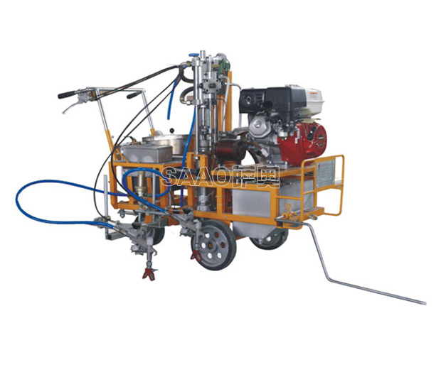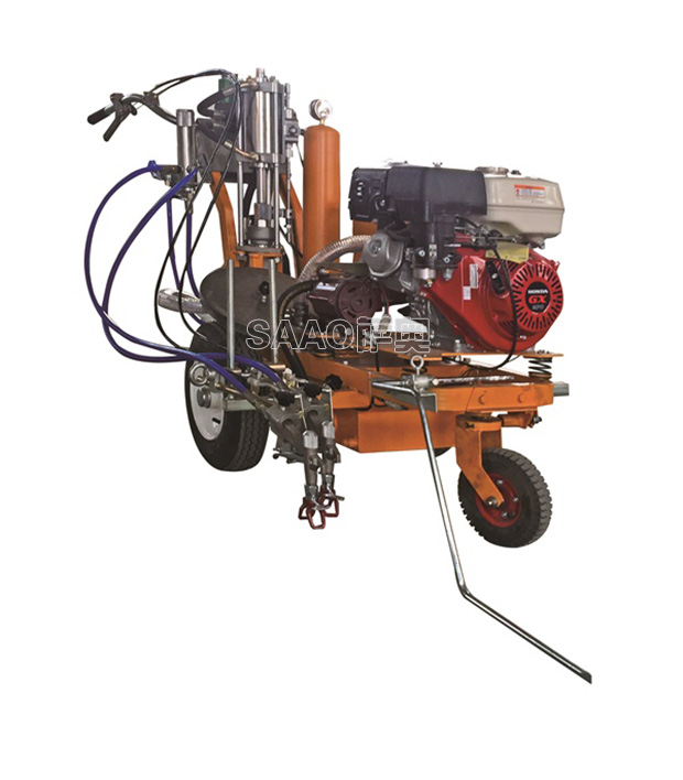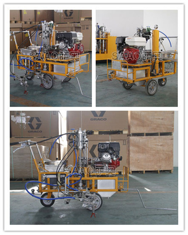 手推車載兩用冷噴劃線機為高雅力等流量型無氣噴涂機,該機利用汽油機驅動單柱塞泵,是涂料在機內形成高壓進行噴涂,所以劃線厚薄均勻角齊,噴槍架導向桿升降設計