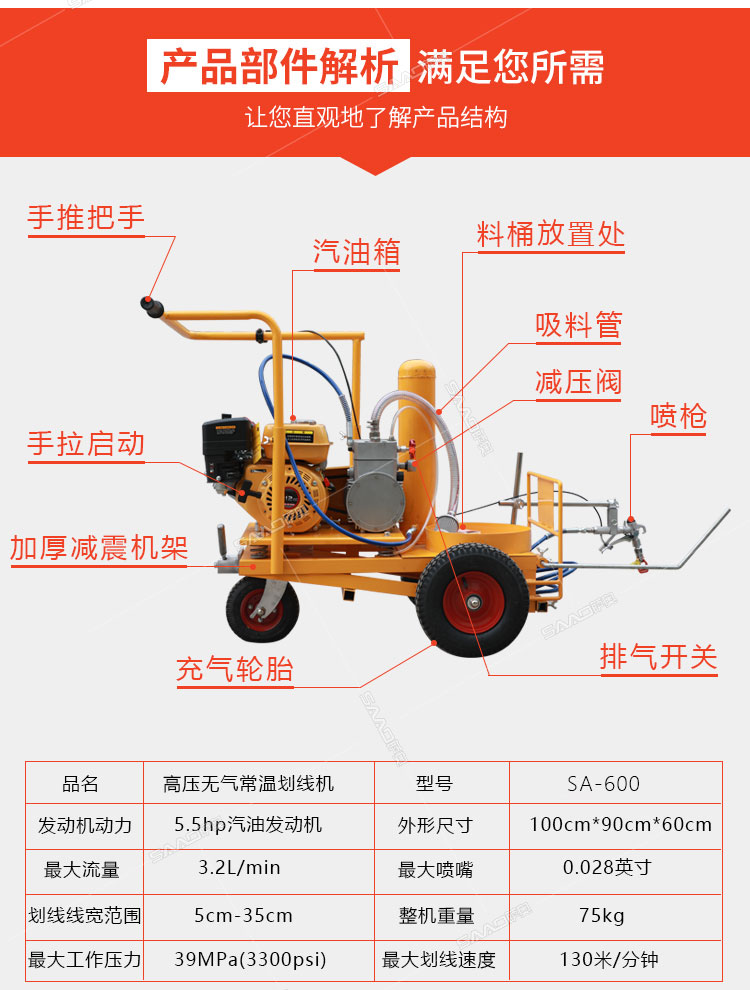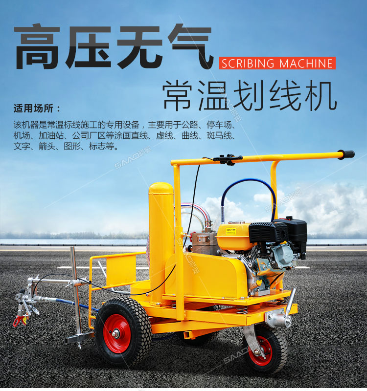 冷噴劃線機是常溫標線施工的專用設備,噴出的線型清晰、流暢、飽滿、均勻,主要用于公路、停車場、機場、加油站、公司廠區等涂畫直線、虛線、曲線、斑馬線、文字、箭頭、圖形