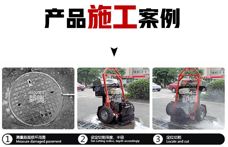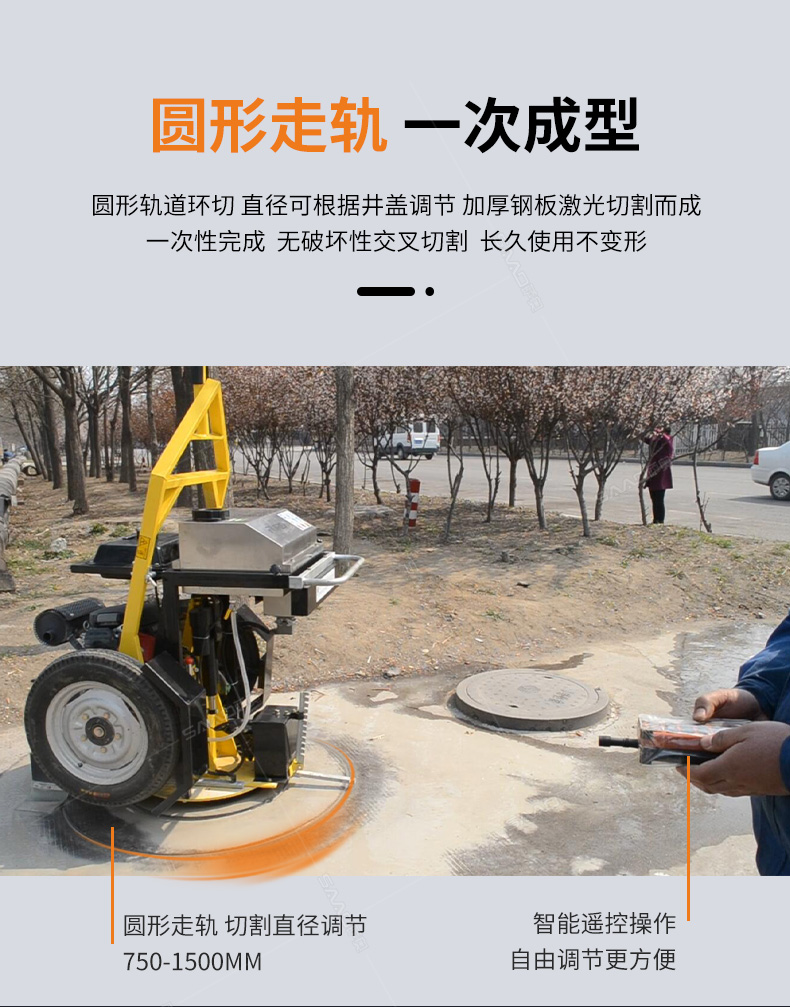 SQJ-1500型井蓋切割機,專門用于對城市道路中機動車道等井蓋周圍的水泥混凝土或瀝青路面進行圓形切割。為清楚井蓋周圍的破損路面提供分割區域,修復后的地面美觀,延長了路面的使用壽命。