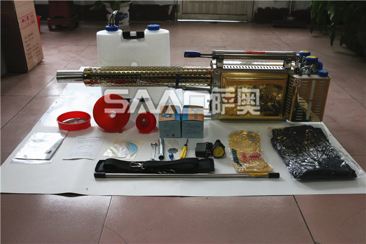 (1) 該煙霧機啟動時方法如下,用手按住點火開關(此時聽到噠、噠、噠的點火聲)握住氣筒進行打氣,機械啟動后,先預熱1分鐘左右,當聽到機械平穩而有力的聲音后,便可正常工作(一般情況下,燃料比較多時,打氣時輕一些。燃料較少時,打氣時用力一些。)啟動前檢查塑料桶蓋是否擰緊,桶蓋不嚴漏氣,機械不能正常噴霧。