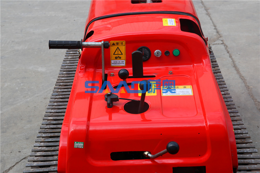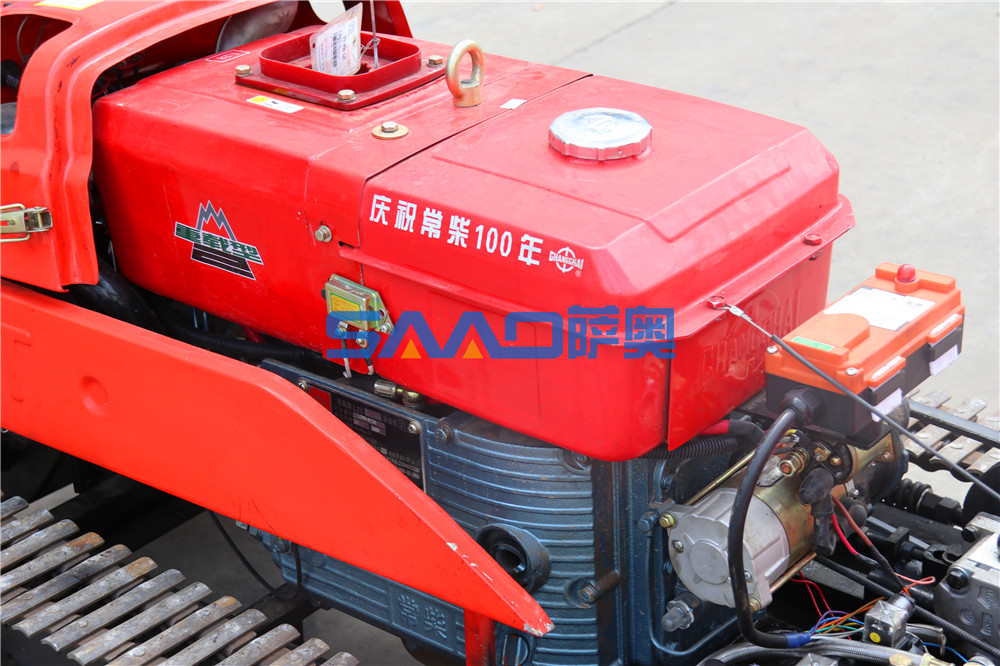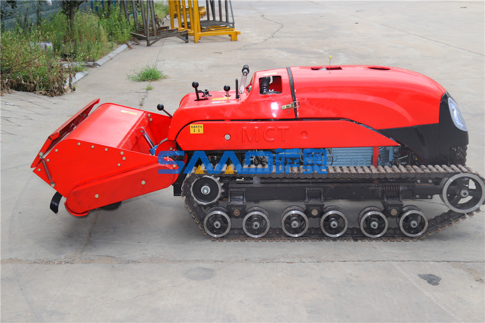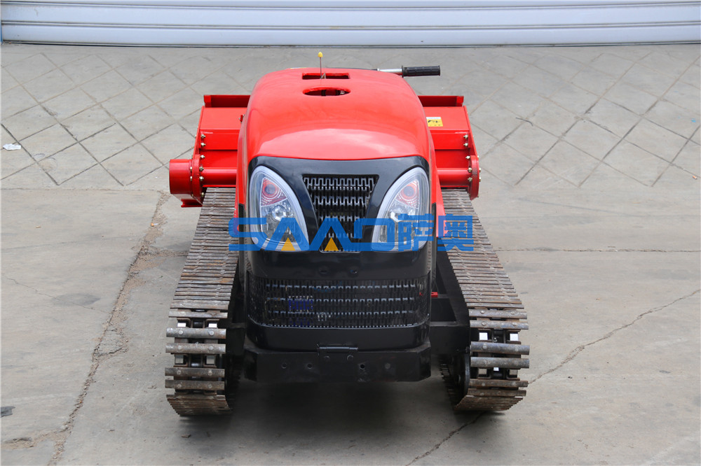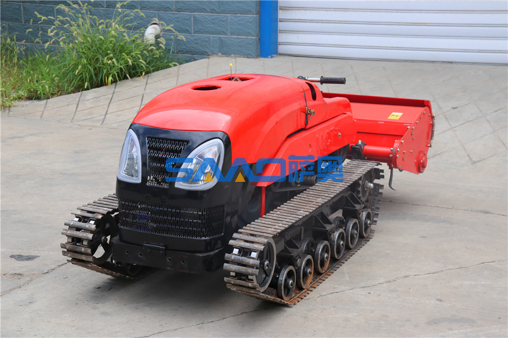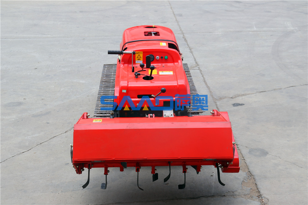 遙控履帶自走式旋耕機是在機械操縱的基礎上,采用先進的電子集成控制系統(tǒng)和液壓系統(tǒng)相結合,改進設計為機械、遙控兩套操縱系統(tǒng)??梢噪S機操縱,也可以人機分離、遙控操縱。使履帶自走式旋耕機實現(xiàn)了手、自一體化操作,從而大大降低了操作人員的勞動強度,更大程度上保證了操作人員的人身安全。