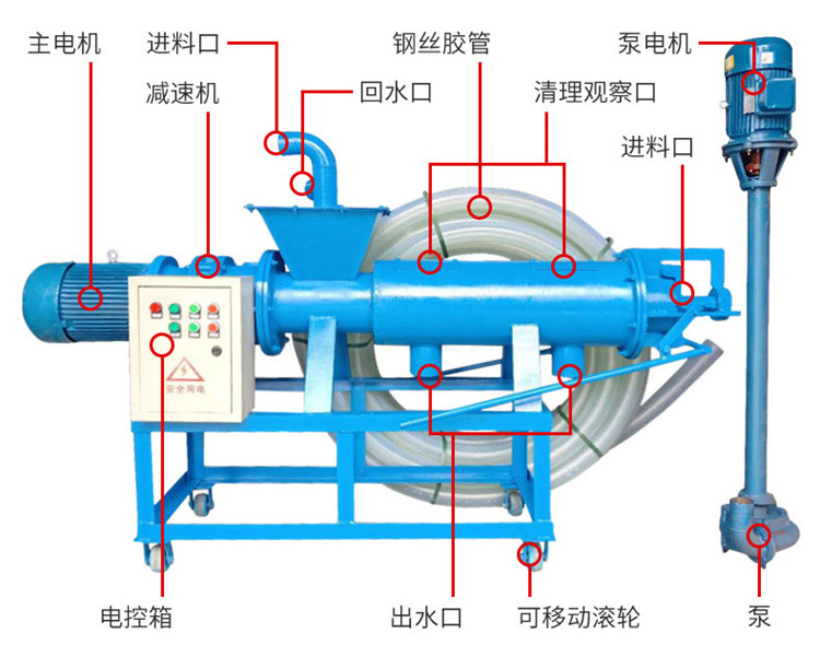 禽畜類糞便處理機(jī)能將雞糞、牛糞、豬糞等禽畜糞便原糞水分離為液態(tài)有機(jī)肥和固態(tài)有機(jī)肥。液態(tài)有機(jī)肥可直接用于農(nóng)作物利用吸收,固態(tài)有機(jī)肥可運(yùn)到缺肥地區(qū)使用,也可起到改善土壤結(jié)構(gòu)的作用,同時(shí)經(jīng)過(guò)發(fā)酵可制成有機(jī)復(fù)合肥。用泥漿泵將原糞水送至機(jī)內(nèi),通過(guò)安置在篩網(wǎng)中的螺旋軸,擠壓分離出固態(tài)物質(zhì),液體則通過(guò)篩網(wǎng)從出液口流出。