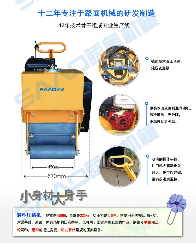 概述: 主要用于溝渠基礎,道路,體育場地的壓實整平,也可用于壓實瀝青表面的作業。