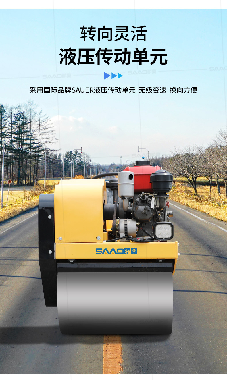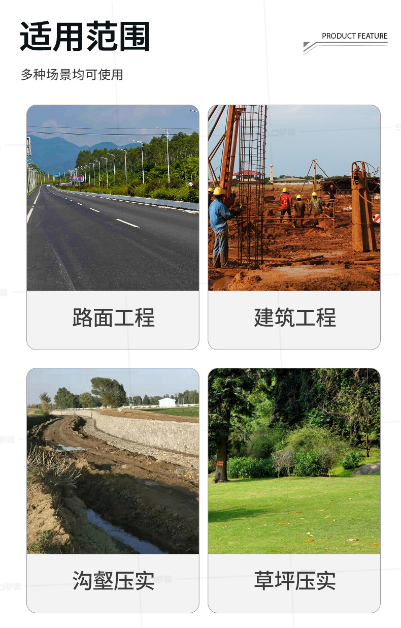用于壓實瀝青表面,壓實礫石、沙土等工程基礎,碾壓草坪,作業半徑小,可在狹小的區域內工作;國內名優柴油機,名牌品質保證,性能優越,啟動容易;